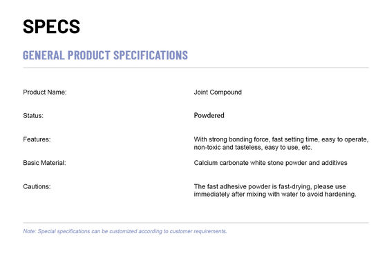 The fast adhesive powder is fast-drying, please use immediately after mixing with water to avoid hardening. |
